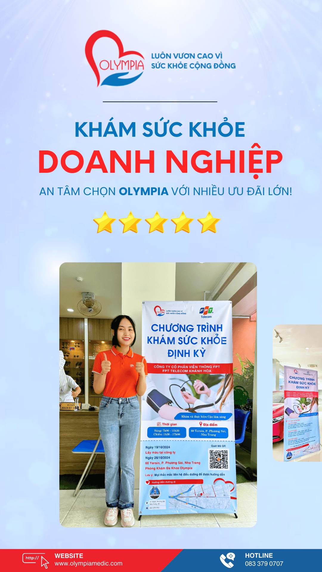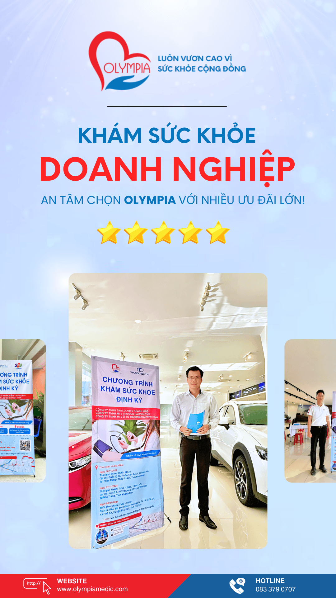 - Linh Động trong Cung Cấp Dịch Vụ: Olympia cung cấp cả hai hình thức khám tại phòng khám hoặc khám ngoại viện tại doanh nghiệp. Đội ngũ y tế sẽ linh hoạt đến trực tiếp nơi làm việc để thực hiện các hạng mục kiểm tra sức khỏe nếu doanh nghiệp có yêu cầu, giúp tối ưu thời gian và thuận tiện cho doanh nghiệp.