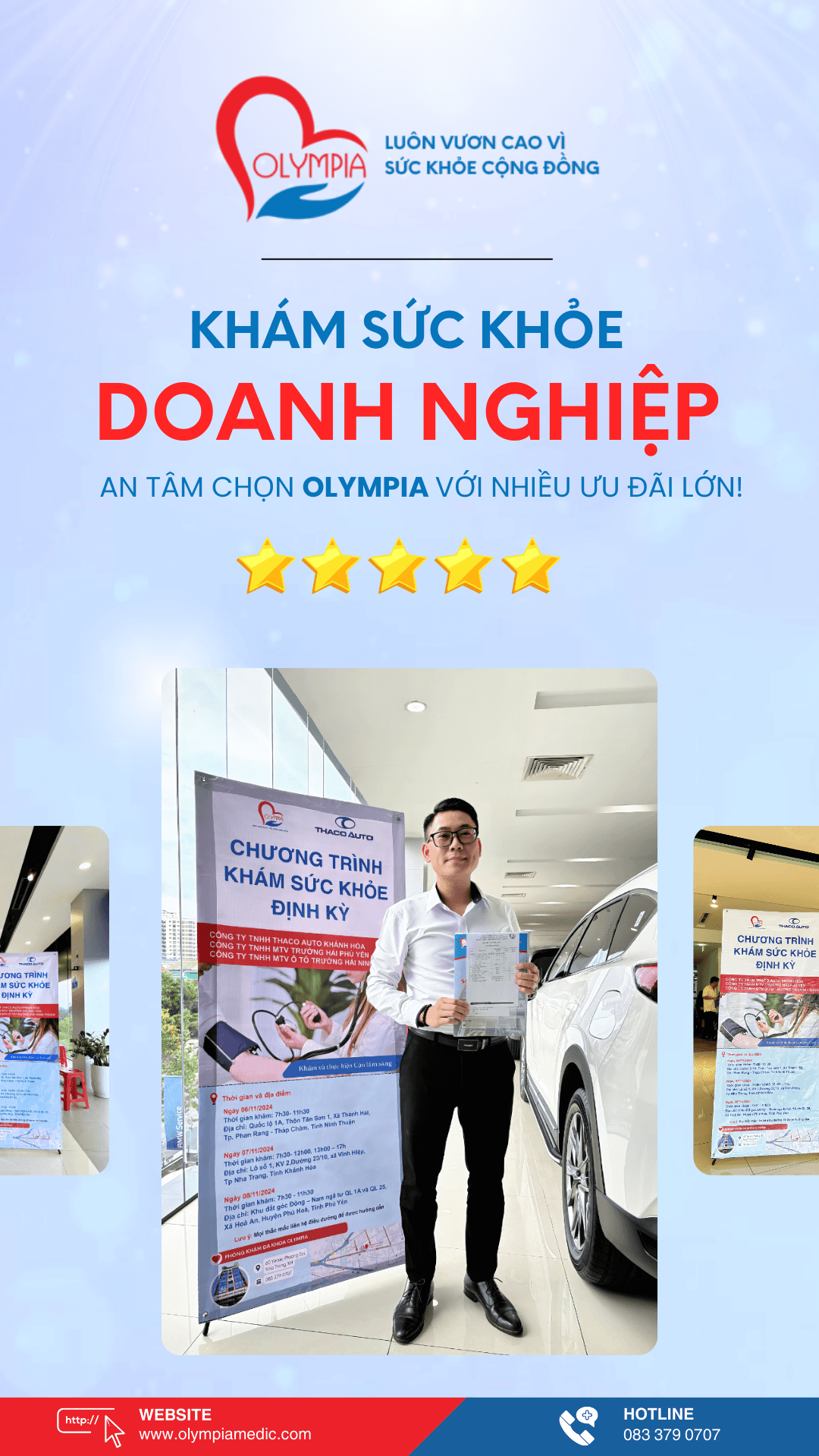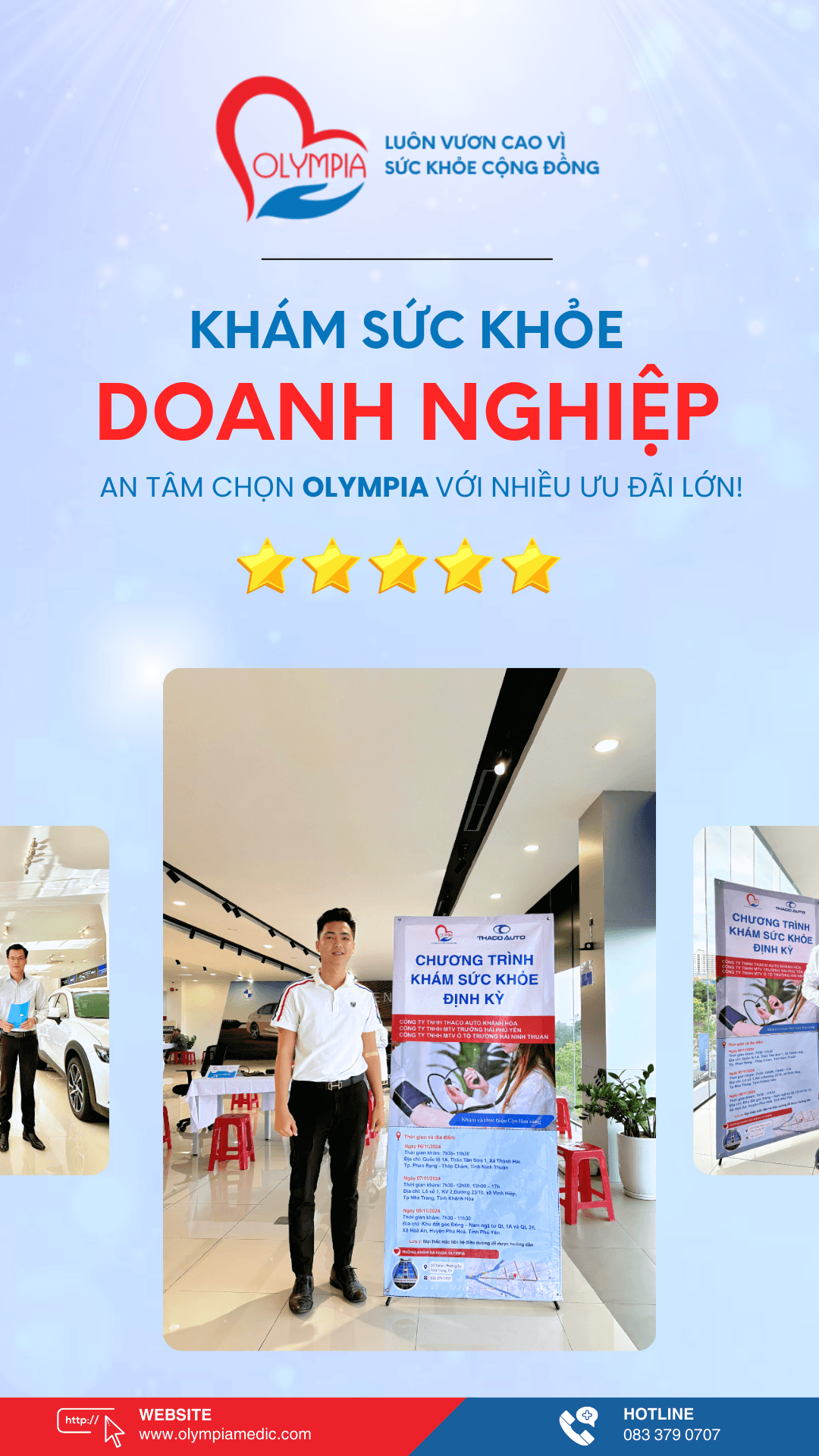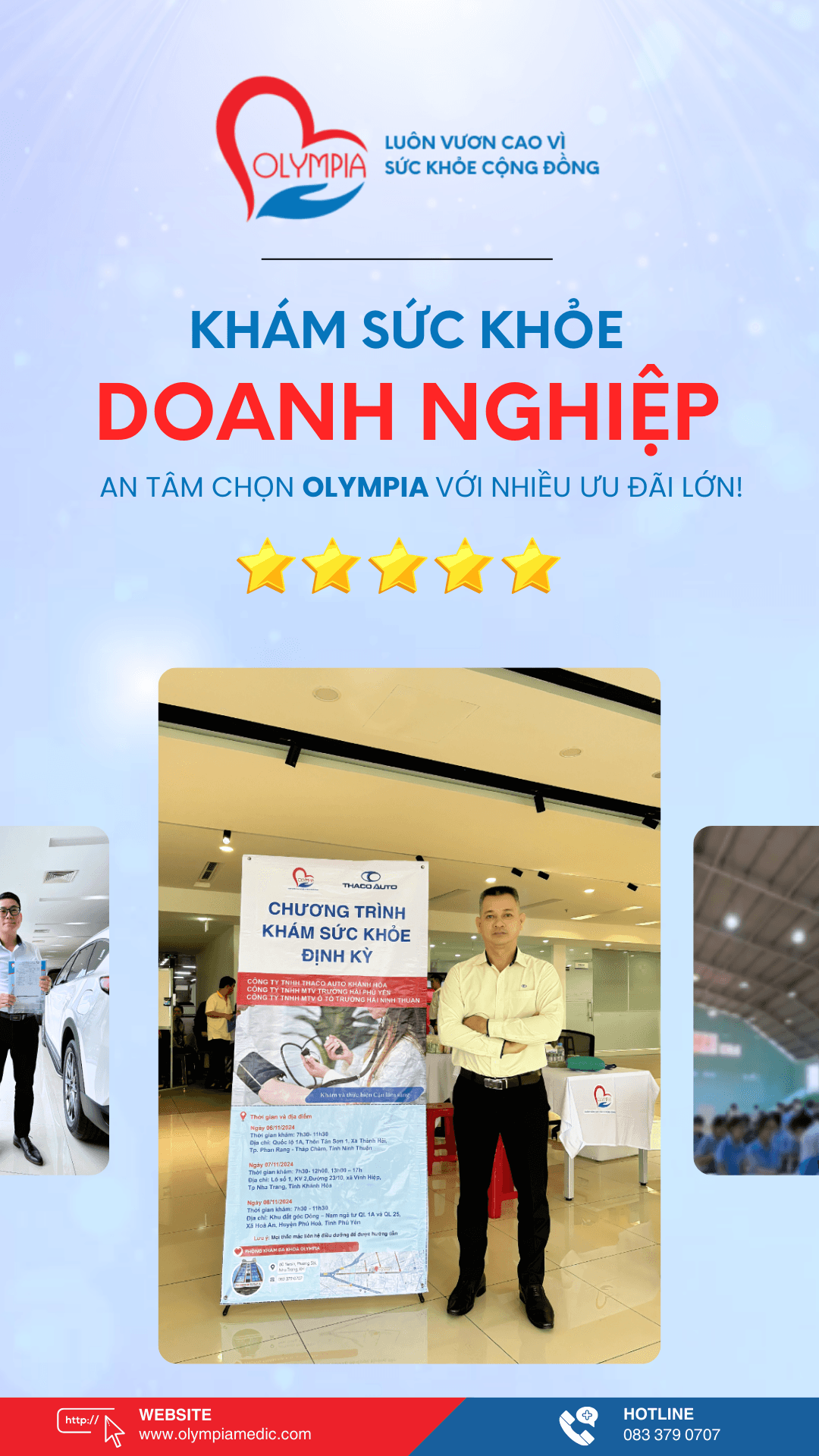 Chăm sóc sức khỏe cho nhân viên là một trong những chiến lược đầu tư quan trọng giúp doanh nghiệp phát triển bền vững. Phòng Khám Đa Khoa Olympia tự hào là đối tác đồng hành đáng tin cậy, cung cấp các gói dịch vụ khám sức khỏe toàn diện, góp phần đảm bảo sự an tâm và sức khỏe của đội ngũ nhân viên.